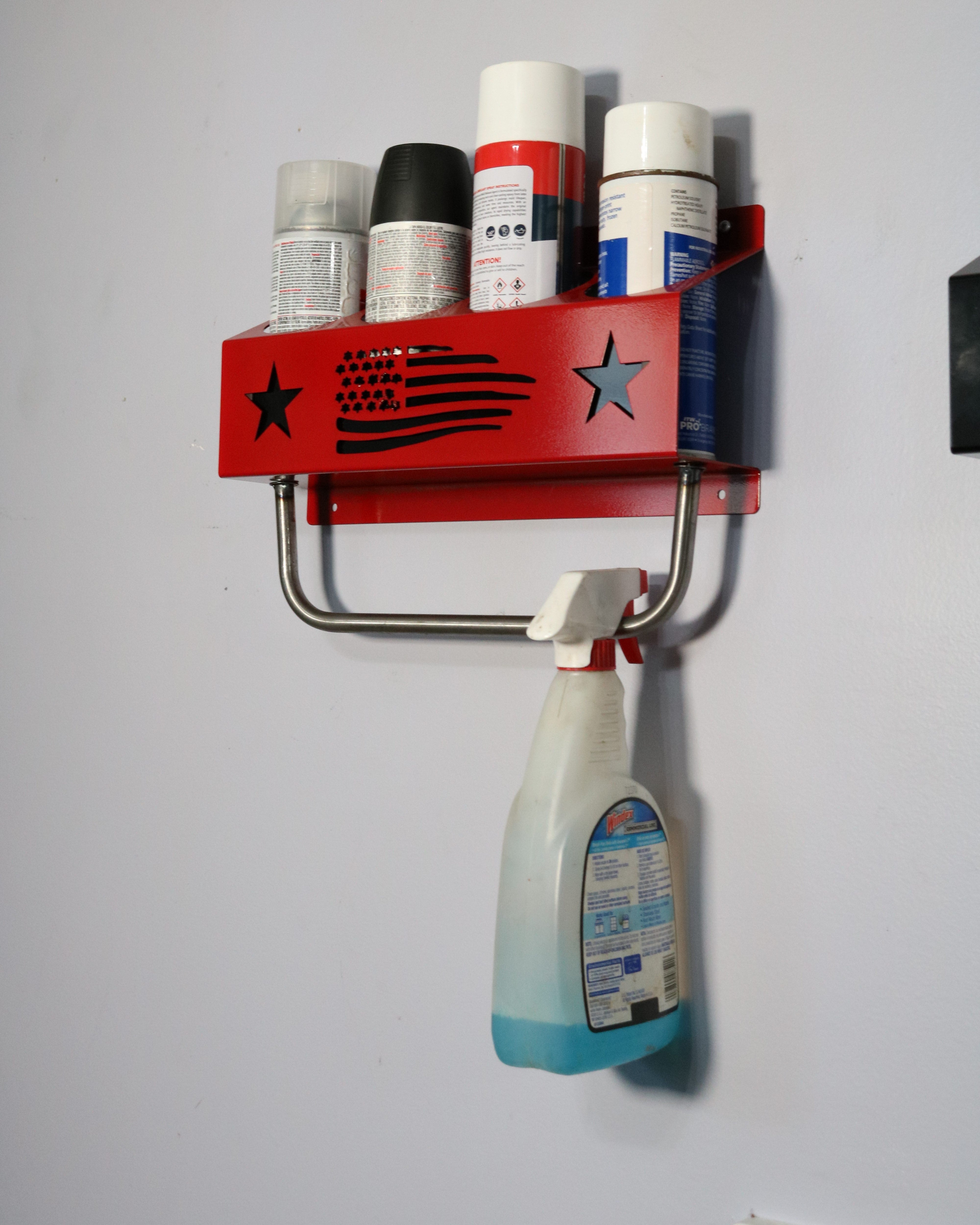This heavy duty organizer features a striking red and black color scheme with a laser-cut American flag, front and center. The Backplate option adds even more pop, framing our design with a contrasting steel background. With bold color combinations and a patriotic design, this spray can holder is perfect for any mechanic, artist, or hobbyist. Our Spray bottle bar add-on includes a screw-on bar that hangs from the shelf, allowing you to hang lubricants and cleaners while maximizing space.