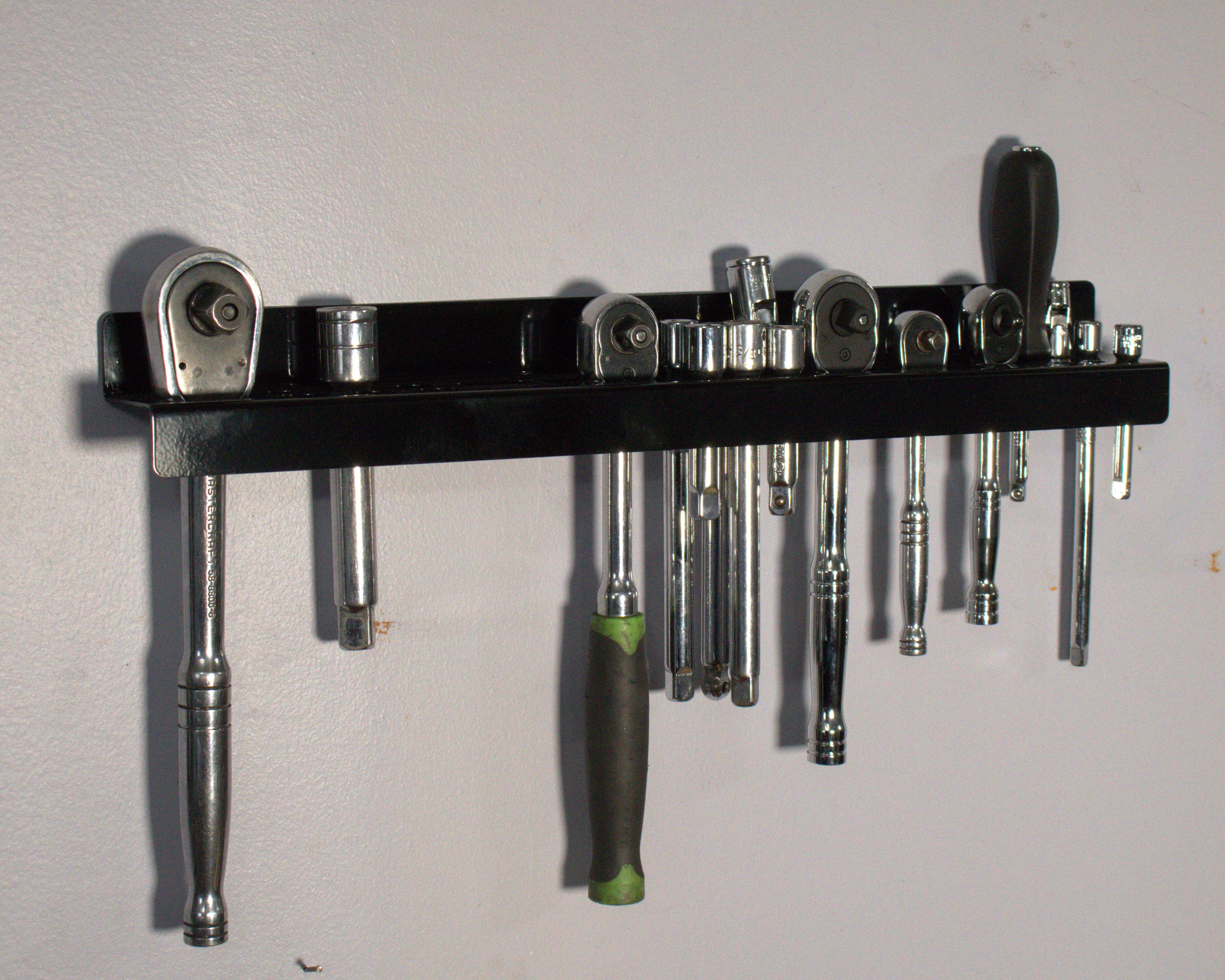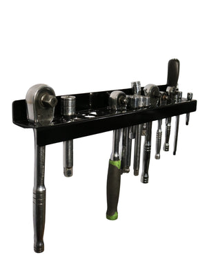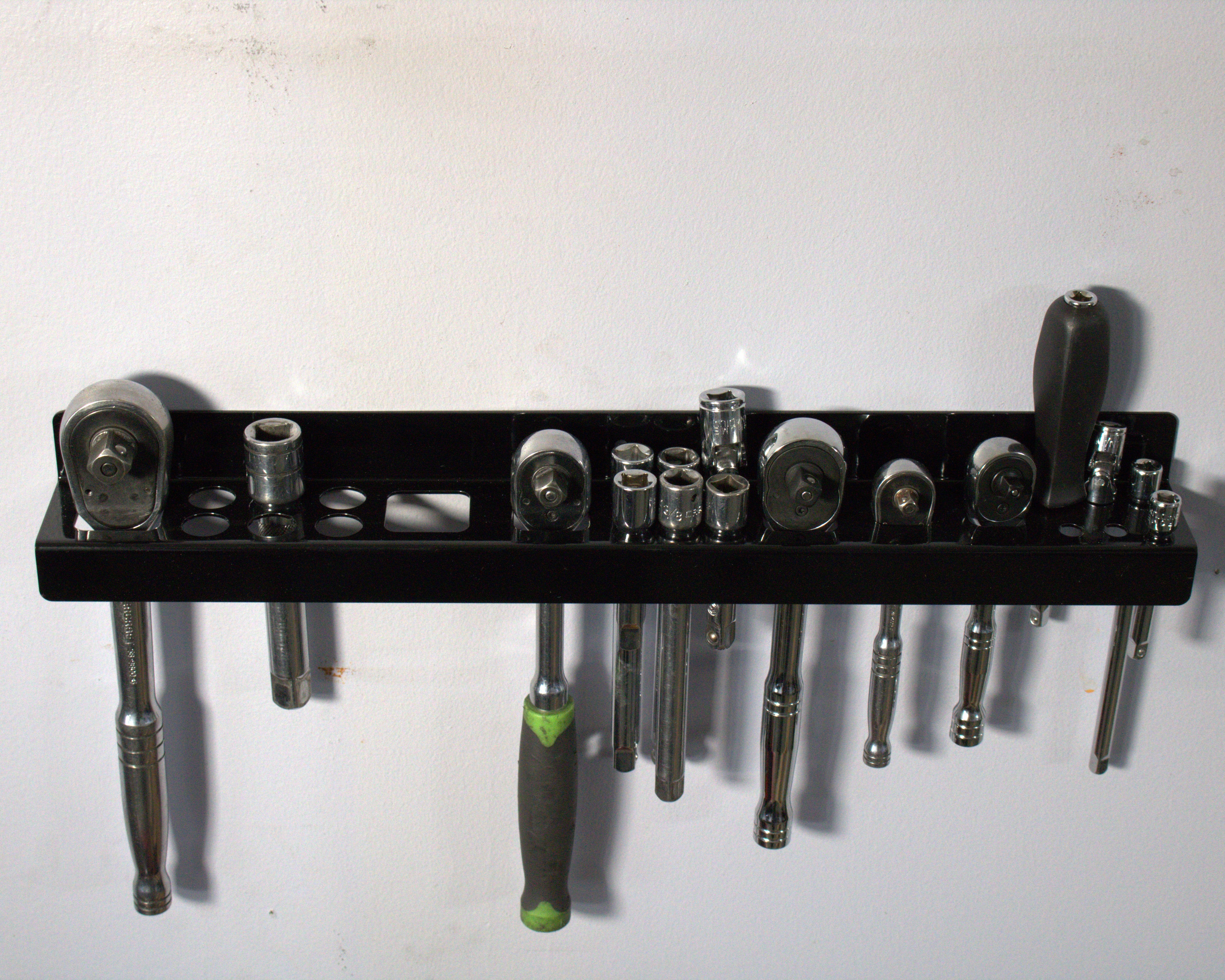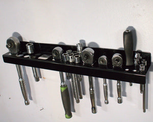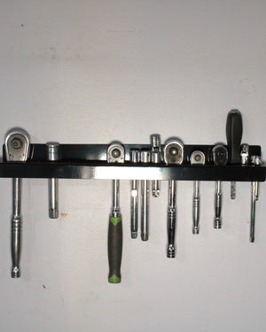 This Ratchet Holder is a perfect companion for the Socket Buddy™ and has enough slots to make sure every ratchet has a home. This wall mounted organizer has slots for ratchets and extensions of all makes and sizes. Save space in your drawers or garage with another one of our organizational products!